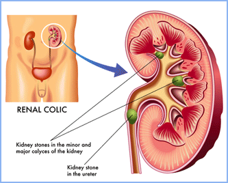पीठ के निचले हिस्से में अथवा पेट के निचले भाग में अचानक तेज दर्द, जो पेट व जांघ के संधि क्षेत्र तक जाता है। दर्द फैल सकता है या बाजू, श्रोणि, उरू मूल, गुप्तांगो तक बढ़ सकता है, यह दर्द कुछ मिनटो या घंटो तक बना रहता है तथा बीच-बीच में आराम मिलता है। दर्दो के साथ जी मिचलाने तथा उल्टी होने की शिकायत भीहो सकती है। यदि मूत्र संबंधी प्रणाली के किसी भाग में संक्रमण है तो इसके लक्षणों में बुखार, कंपकंपी, पसीना आना, पेशाब आने के साथ-साथ दर्द होना आदि भी शामिल हो सकते हैं ; बार बार और एकदम से पेशाब आना, रुक रुक कर पेशाब आना, रात में अधिक पेशाब आना, मूत्र में रक्त भी आ सकता है। अंडकोशों में दर्द, पेशाब का रंग असामान्य होना। गुर्दे की पथरी के ज्यादातर रोगी पीठ से पेट की तरफ आते भयंकर दर्द की शिकायत करते हैं। यह दर्द रह-रह कर उठता है और कुछ मिनटो से कई घंटो तक बना रहता है इसे ”रीलन क्रोनिन” कहते हैं। यह रोग का प्रमुख लक्षण है, इसमें मूत्रवाहक नली की पथरी में दर्दो पीठ के निचले हिस्से से उठकर जांघों की ओर जाता है।