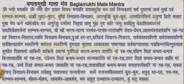 नमो भगवति, ˙ नमो वीर प्रताप विजय भगवति, बगलामुखि! मम सर्वनिन्दकानां सर्वदुष्टानां वाचं मुखं पदं स्तंभय, जिह्नां कीलय, बुद्धिं विनाशय विनाशय, अपर-बुद्धिं कुरू कुरू, आत्मविरोधिनां शत्रुणां शिरो, ललाटं, मुखं, नेत्र, कर्ण, नासिकोरू, पद, अणु-अणु, दंतोष्ठ, जिह्नां, तालु, गुह्य, गुदा, कटि, जानु, सर्वांगेषु केशादिपादांतं पादादिकेशपर्यन्तं स्तंभय स्तंभय, खें खीं मारय मारय, परमंत्र, परयंत्र, परतंत्राणि छेदय छेदय, आत्ममंत्र तंत्राणि रक्ष रक्ष, ग्रहं निवारय निवारय, व्याधिं विनाशय विनाशय दुःखं हर हर, दारिद्रयं निवारय निवारय, सर्वमंत्र स्वरूपिणि दुष्टग्रह भूतग्रह पाषाणग्रह सर्व चांडालग्रह यक्ष किन्नर किंपुरूष ग्रह भूत प्रेत पिशाचानां शाकिनी डाकिनीग्रहाणां पूर्व दिशं बंधय बंधय, वार्तालि! मां रक्ष रक्ष, दक्षिण दिशं बंधय बंधय, स्वप्नवार्तालि मां रक्ष रक्ष, पश्चिमदिशं बंधय बंधय उग्रकालि मां रक्ष रक्ष, पाताल दिशं बंधय बंधय बगला परमेश्वरि मां रक्ष रक्ष, सकल रोगान् विनाशय विनाशय, शत्रु पलायनम् पंचयोजनमध्ये राजजनस्वपचं कुरू कुरू, शत्रुन् दह दह, पच पच, स्तंभय मोहय मोहय, आकर्षण-आकर्षय, मम शत्रुन् उच्चाटय उच्चाटय, ींीं फट्स्वाहा!