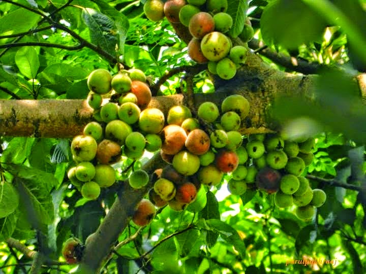 - इसके भालाकार पत्ते 10 से सत्रह सेमी लंबे होते हैं जो जनवरी से अप्रैल तक निकलते हैं। इसकी छाल का रंग लाल−घूसर होता है। फल गोल, गुच्छों में लगते हैं। फल मार्च से जून तक आते हैं। कच्चा फल छोटा हरा होता है पकने पर फल मीठे, मुलायम तथा छोटे−छोटे दानों से युक्त होता है। इसका फल देखने में अंजीर के फल जैसा लगता है। इसके तने से क्षीर निकलता है।